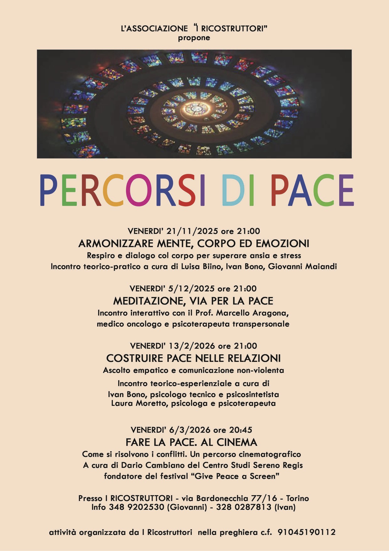 Un ciclo di conferenze/incontri esperienziali per declinare la pace nei diversi piani della nostra esistenza: il rapporto con le emozioni, il rapporto con lo spazio interiore e il mondo delle relazioni.